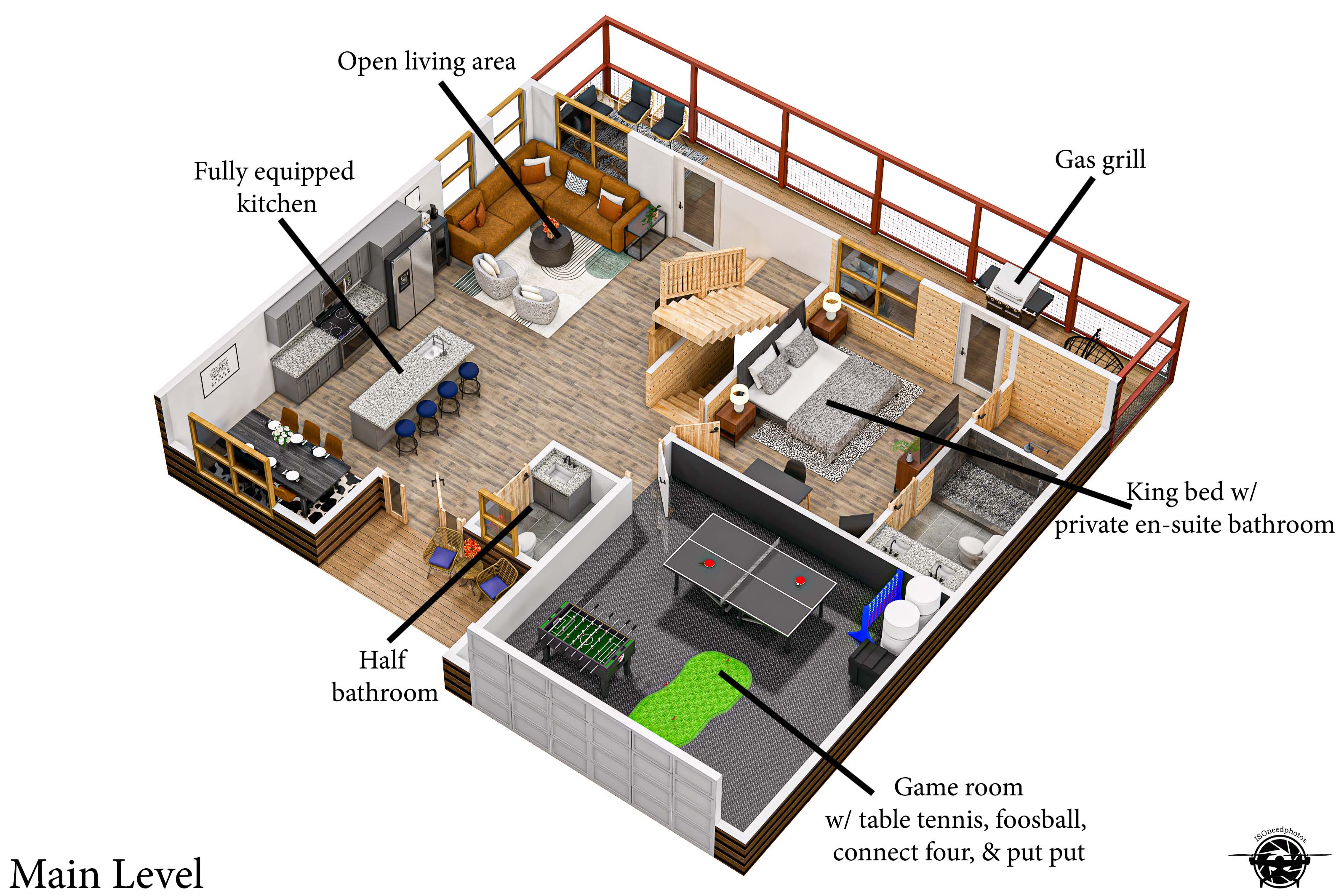 Flip through the 3D floor plans for each floor, then use the map to confirm the cabin’s spot in Sevierville—quick access, no steep roads, and close to the Parkway.