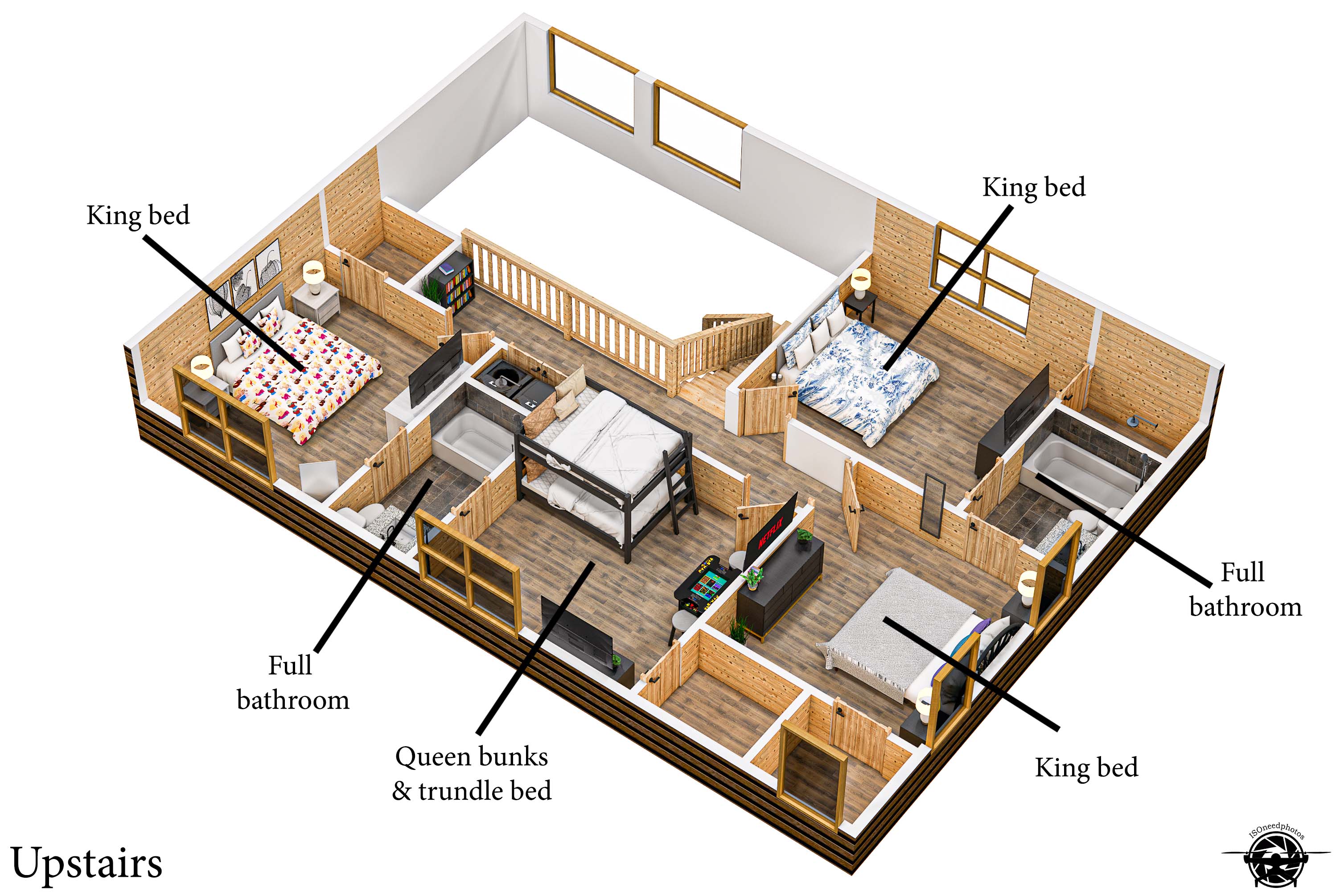 🛏Bedroom 4 (Upstairs) – Bunk room with 2 queen beds, a queen trundle (sleeps 6 comfortably). Ideal for kids or young adults. Private closet. 43" Smart TV.